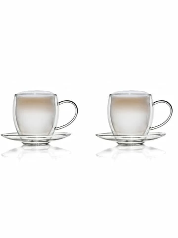 Das Creano Thermoglas „DG-B-U, 400ml“Die Creano Thermogläser sind stylisch und funktional zu gleich – das mundgeblasene Doppelwandglas mit seinen hervorragenden Isoliereigenschaften macht’s möglich! Zur Herstellung wird hitzebeständiges Borosilikatglas verwendet, welches leicht und filigran ist, aber dennoch die hohen Anforderungen des Alltagsgebrauchs meistert.Dank des Isoliereffektes – ermöglicht durch die Luft zwischen den Glasschichten – bleiben Heißgetränke wie Kaffee oder Tee länger heiß und Kaltgetränke länger kalt. Zudem sorgt das Doppelwandglas für ein stets gleichmäßig temperiertes Außenglas, so dass auch ein mögliches Verbrennen der Finger der Vergangenheit angehört. Toller Effekt außerdem: kein störendes Kondenswasser, somit keine lästigen Ränder auf dem Tisch beim Genuss von Kaltgetränken.Die Merkmale der Thermogläser:isolierendhandgearbeitethergestellt aus hitzebeständigem Borosilikatglas400ml FassungsvermögenspülmaschinengeeignetDer Inhalt:2 Creano Thermoglas“DG-bauchig-U, 400ml“ mit Untertasse