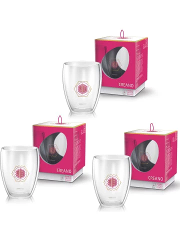 Das Creano Thermoglas Blume des LebensDas Thermoglas „Blume des Lebens“ ist stylisch und funktional zu gleich – das mundgeblasene Doppelwandglas mit seinen hervorragenden Isoliereigenschaften macht’s möglich!Die faszinierende Blume des Lebens befindet sich auf dem Innenglas, so dass diese auch nach langem Gebrauch noch ihre Schönheit behält.Zur Herstellung wird hitzebeständiges Borosilikatglas verwendet, das leicht und filigran ist, aber dennoch robust die hohen Anforderungen des Alltagsgebrauchs meistert.Dank des Isoliereffektes – ermöglicht durch die Luft zwischen den Glasschichten – bleiben Heißgetränke wie Kaffee oder Tee länger heiß und Kaltgetränke länger kalt. Zudem sorgt das Doppelwandglas für ein stets gleichmäßig temperiertes Außenglas, so dass auch ein mögliches Verbrennen der Finger der Vergangenheit angehört.Toller Effekt außerdem: kein störendes Kondenswasser, somit keine lästigen Ränder auf dem Tisch beim Genuss von Kaltgetränken.Die Merkmale des Thermoglases:isolierendhandgearbeitethergestellt aus hitzebeständigem Borosilikatglas250ml FassungsvermögenspülmaschinengeeignetDer Inhalt:3 Creano Thermogläser „Blume des Lebens“ in exklusiver und attraktiver Geschenkverpackung