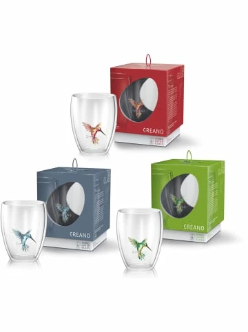 Das Creano – ThermoGlas “Hummi“ ist stylish und funktional zu gleich – das mundgeblasene Doppelwandglas mit seinen hervorragenden Isoliereigenschaften macht´s möglich! Der faszinierende Kolibri befindet sich auf dem Innenglas, sodass dieser auch nach langem Gebrauch seine Schönheit behält. Zur Herstellung wird hitzebeständiges Borosilikatglas verwendet, das leicht und filigran ist, aber dennoch robust die hohen Anforderungen des Alltagsgebrauchs meistert. Dank des Isoliereffektes – ermöglicht durch die Luft zwischen den Glasschichten – bleiben Heißgetränke wie Kaffee oder Tee länger heiß und Kaltgetränke länger kalt. Zudem sorgt das Doppelwandglas für ein stets gleichmäßig temperiertes Außenglas, so dass auch ein mögliches Verbrennen der Finger der Vergangenheit angehört. Toller Effekt außerdem: kein störendes Kondenswasser, somit keine lästigen Ränder auf dem Tisch beim Genuss von Kaltgetränken. Viel Vergnügen mit Ihrem “schwebenden Getränk“, aus dessen Quelle unser Kolibri seinen Nektar zieht! Inhalt: 3 Creano-ThermoGläser “Hummi“ – in den Farben blau, grün, rot. Merkmale: isolierend, handgearbeitet, hitzebeständiges Borosilikatglas, 250ml Fassungsvermögen, spülmaschinenfest