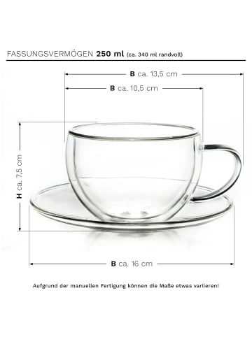 Die Creano – ThermoTasse mit Untertasse ist stylisch und funktional zu gleich – das mundgeblasene Doppelwandglas mit seinenhervorragenden Isoliereigenschaften macht’s möglich! Zur Herstellung wird hitzebeständiges Borosilikatglas verwendet, das leicht und filigran ist, aber dennoch robust die hohen Anforderungen des Alltagsgebrauchs meistert. Dank des Isoliereffektes – ermöglicht durch die Luft zwischen den Glasschichten – bleiben Heißgetränke wie Kaffee oder Tee länger heiß und Kaltgetränke länger kalt. Zudem sorgt das Doppelwandglas für ein stets gleichmäßig temperiertes Außenglas, so dass auch ein mögliches Verbrennen der Finger der Vergangenheit angehört. Toller Effekt außerdem: kein störendes Kondenswasser, somit keine lästigen Ränder auf dem Tisch beim Genuss von Kaltgetränken.Die Merkmale der Thermotasse:isolierendhandgearbeitet hergestellt aus hitzebeständigem Borosilikatglas250ml FassungsvermögenspülmaschinengeeignetDer Inhalt:4x Creano Thermotasse mit Untertasse