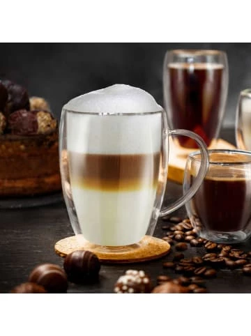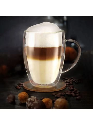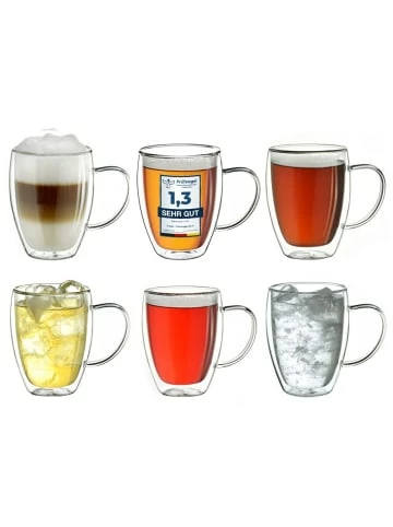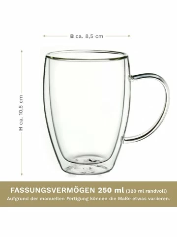Doppelwandige Trinkgläser mit Henkel und Thermoeigenschaften im hohen Design. Im Angebot finden Sie ein 6er Set mit 250ml Fassungsvermögen (320ml randvoll).Thermo-Eigenschaft dank des Doppelwandglases: Heißes bleibt länger heiß und Kaltes länger kalt! Gefertigt aus qualitativ hochwertigem und hitzebeständigem Borosilikatglas. Das Doppelwandglas sorgt zudem stets für ein gleichmäßig temperiertes Außenglas, sodass auch ein mögliches Verbrennen der Finger der Vergangenheit angehört. Zusätzliche Besonderheit: durch den optischem Schwebe-Effekt, scheint das Getränk im Glas zu schweben. Außerdem entsteht kein störendes Kondenswasser, somit keine lästigen Ränder auf dem Tisch beim Genuss von Kaltgetränken, ideal bei der Nutzung als Cocktailglas. Einfach zu reinigen:Spülmaschinengeeignet (im Schongang), mikrowellengeeignet, frostsicher & besonders stoß- & kratzfest. Universell einsetzbar:Als Kaffeeglas für Kaffee oder Latte Macchiato oder auch Teeglas, da es die Getränke sehr lange angenehm heiß hält.Als Kaltgetränkeglas für Schorlen, Wasser oder alle Art von Softgetränken sowie Cocktails und Mischgetränke, da es die Getränke sehr lange kalt hält.Aufgrund der Thermoeigenschaft auch sehr gut als Nachspeisenglas geeignet!Handgearbeitet. Jedes Glas ist mundgeblasen Verschluss auf Glasboden: Jedes Glas ist auf der Unterseite mit einem kleinen Loch versehen, das mit einer Membran verschlossen ist. Dieses geschlossene Loch ist für den Druckausgleich zwischen den Glasschichten unabdingbar. Es verhindert Spannungen und somit möglichen Glasbruch.
