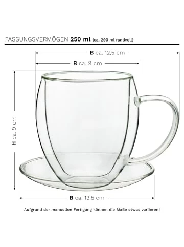 Die Creano ThermogläserDie Creano Thermogläser „DG-B-U, 250ml“ sind stylisch und funktional zu gleich – das mundgeblasene Doppelwandglas mit seinen hervorragenden Isoliereigenschaften macht’s möglich! Zur Herstellung wird hitzebeständiges Borosilikatglas verwendet, welches leicht und filigran ist, aber dennoch die hohen Anforderungen des Alltagsgebrauchs meistert.Dank des Isoliereffektes – ermöglicht durch die Luft zwischen den Glasschichten – bleiben Heißgetränke wie Kaffee oder Tee länger heiß und Kaltgetränke länger kalt. Zudem sorgt das Doppelwandglas für ein stets gleichmäßig temperiertes Außenglas, so dass auch ein mögliches Verbrennen der Finger der Vergangenheit angehört. Toller Effekt außerdem: kein störendes Kondenswasser, somit keine lästigen Ränder auf dem Tisch beim Genuss von Kaltgetränken.Die Merkmale der Thermogläser:isolierend; handgearbeitethergestellt aus hitzebeständigem Borosilikatglas250ml FassungsvermögenspülmaschinengeeignetDer Inhalt:6 Creano Thermogläser „DG-Bauchig-U, 250ml“ mit Untertasse