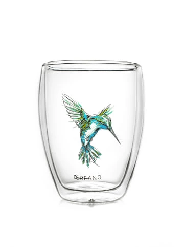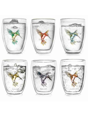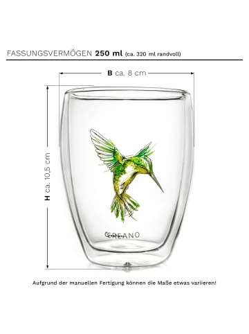 Das Creano – ThermoGlas “Hummi“ ist stylish und funktional zu gleich – das mundgeblasene Doppelwandglas mit seinen hervorragenden Isoliereigenschaften macht´s möglich! Der faszinierende Kolibri befindet sich auf dem Innenglas, sodass dieser auch nach langem Gebrauch seine Schönheit behält. Zur Herstellung wird hitzebeständiges Borosilikatglas verwendet, das leicht und filigran ist, aber dennoch robust die hohen Anforderungen des Alltagsgebrauchs meistert. Dank des Isoliereffektes – ermöglicht durch die Luft zwischen den Glasschichten – bleiben Heißgetränke wie Kaffee oder Tee länger heiß und Kaltgetränke länger kalt. Zudem sorgt das Doppelwandglas für ein stets gleichmäßig temperiertes Außenglas, so dass auch ein mögliches Verbrennen der Finger der Vergangenheit angehört. Toller Effekt außerdem: kein störendes Kondenswasser, somit keine lästigen Ränder auf dem Tisch beim Genuss von Kaltgetränken. Viel Vergnügen mit Ihrem “schwebenden Getränk“, aus dessen Quelle unser Kolibri seinen Nektar zieht! Inhalt: 6 Creano-ThermoGläser “Hummi“ – in den Farben blau, grün, rot, gelb, orange, lila. Merkmale: isolierend, handgearbeitet, hitzebeständiges Borosilikatglas , 250ml Fassungsvermögen, spülmaschinenfest