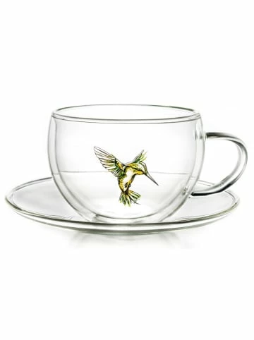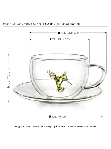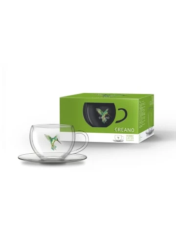 Das Creano – ThermoTassen “Hummi“ ist stylish und funktional zu gleich – das mundgeblasene Doppelwandglas mit seinen hervorragenden Isoliereigenschaften macht´s möglich! Der faszinierende Kolibri befindet sich auf dem Innenglas, sodass dieser auch nach langem Gebrauch seine Schönheit behält. Zur Herstellung wird hitzebeständiges Borosilikatglas verwendet, das leicht und filigran ist, aber dennoch robust die hohen Anforderungen des Alltagsgebrauchs meistert. Dank des Isoliereffektes – ermöglicht durch die Luft zwischen den Glasschichten – bleiben Heißgetränke wie Kaffee oder Tee länger heiß und Kaltgetränke länger kalt. Zudem sorgt das Doppelwandglas für ein stets gleichmäßig temperiertes Außenglas, so dass auch ein mögliches Verbrennen der Finger der Vergangenheit angehört. Toller Effekt außerdem: kein störendes Kondenswasser, somit keine lästigen Ränder auf dem Tisch beim Genuss von Kaltgetränken. Viel Vergnügen mit Ihrem “schwebenden Getränk“, aus dessen Quelle unser Kolibri seinen Nektar zieht! Inhalt: 1 Creano-ThermoTasse mit Untertasse “Hummi“ – grün in exklusiver Geschenkbox. Merkmale: isolierend, handgearbeitet, hitzebeständiges Borosilikatglas, 250ml Fassungsvermögen, spülmaschinenfest