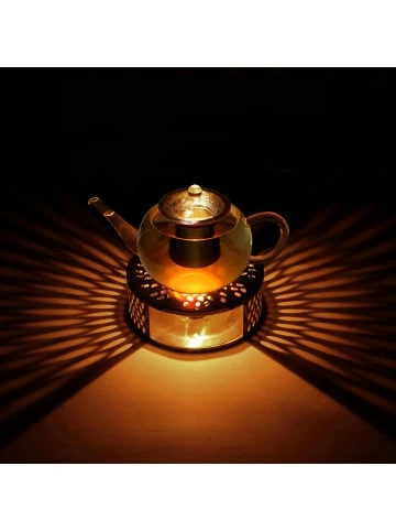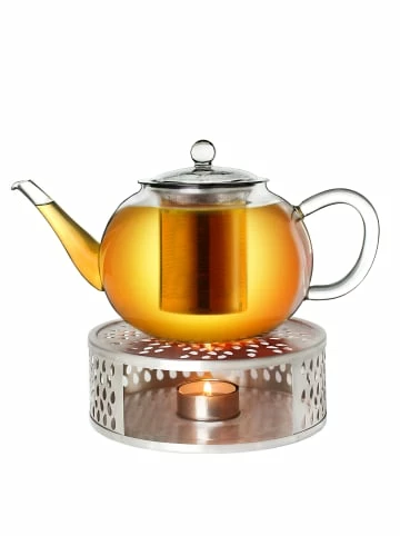 1 x Stövchen aus Edelstahl15.5 x 15.5 x 5.8 cmEIGENSCHAFTEN:· zum Warmhalten von Heißgetränken aller Art· gefertigt aus rostfreiem Edelstahl · inkl. herausnehmbarem Einsatz für Teelicht· geeignet für alle gängigen Teekannengrößen· Design erzeugt optisch anmutende Lichteffekte· leicht zu reinigen, geeignet für Geschirrspülmaschine1x Teekanne 800ml „bauchig“:ANGEBOT: Die Glaskanne mit Deckel und Edelstahlsieb im zeitlosen Design fasst 1l, das entspricht ca. 3-4 Tassen. Der Teebereiter ist ideal für die Zubereitung von losem Tee, Kräutertee, Früchtetee, Teebeutel, Teeblumen aber auch für Kaffee, Eistee, Säfte und Schorlen geeignet. Geliefert wird in einen hochwertigen Geschenkkarton.BESONDERHEITEN: Durch das robuste und hitzebeständige Borosilikatglas kann die Teekanne relativ dünnwandig produziert werden und hat trotzdem eine sehr hohe Stoß- & Kratzfestigkeit. Der Vorteil: die Tee-Kanne ist leicht und filigran. Das extra feine Sieb, hält selbst feinste Teepartikel zurück, somit befinden keine lästigen Schwebstoffe im Getränk. Vorsicht beim Umgang mit kochendem Wasser, Kinder sind unbedingt fern zu halten.Die Glasteekanne und der Siebeinsatz sind 100% spülmaschinenfest, frei von Chemikalien und absolut geschmacksneutral. Perfekt für einen sorglosen & puren Tee-Genuss.100% TROPFFREI: Der Ausgießer besitzt innen eine extra Vertiefung und außen eine kleine Nase die jeden Tropfen zurück hält und die Teekanne damit 100% tropffrei macht. Achtung: Da es sich um einen Glasartikel handelt, seien Sie bitte bei der Reinigung vorsichtig.