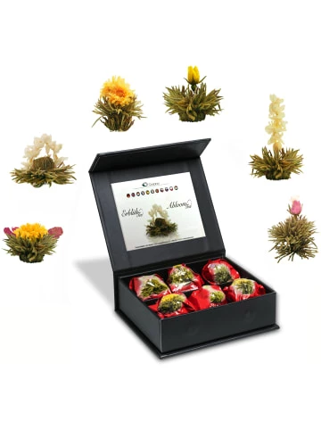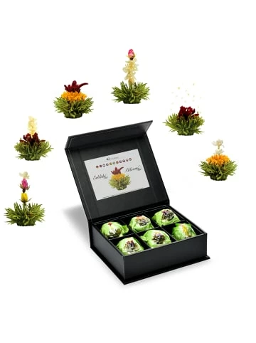 Set, bestehend aus hochwertigen 6er ErblühTee-Boxen mit edler Prägung und Magnetverschluss:– 6er Box mit Magnetverschluss ErblühTee Weißer Tee in 6 Sorten– 6er Box mit Magnetverschluss ErblühTee Grüner Tee „Fruity Flavor“ in 6 Geschmackssorten (Kirsche, Mango, Lemon, Himbeere, Erbeere, Pfirsich)Das ErlebnisDer ErblühTee bietet dem Genießenden ein außergewöhnliches Erlebnis: Im Innern der Kugel befindet sich eine kunstvoll eingebundene exotische Blüte. Ihr Geheimnis entfaltet die Kugel aber erst, wenn sie in ein Gefäß mit kochend heißem Wasser gegeben wird. Sie beginnt sich langsam zu öffnen und bringt am Ende der Aufgussinszenierung die eingebettete Blüte hervor, die formenreich und farbenprächtig aus ihr emporsteigt.An diesem Tee ist fast alles Handarbeit. Nur wenigen so genannten Meisterbinderinnen ist es vorbehalten, die getrockneten Blätter des Weißen Tees zu einer Kugelform zu binden, denn das Wissen um diese seltene Kunst wird streng behütet. So bleibt der ErblühTee eine wertvolle Rarität Chinas.Die Zubereitung:Schritt 1: Wasser aufkochen und unverzüglich in Glaskaraffe geben. Bitte beachten: Im Gegensatz zur Grünteezubereitung ist hier die Verwendung von kochend heißem Wasser notwendig, um eine optimale Öffnung der ErblühTee-Kugeln zu gewährleisten.Schritt 2: ErblühTee-Kugel vorsichtig ins Wasser geben und staunen…Schritt 3: Bitte die empfohlene Ziehdauer beachten. Es sind 2-3 Aufgüsse möglich, die in ihrer Geschmacksintensität variieren werden.ZUTATEN:Weißer Tee, Blüten von Ringelblume, Pfingstrose, Rose, JasminZUTATEN:Grüner Tee, Blüten von Hibiskus, Ringelblume, Jasmin, Rose und Holunder, Aroma (Pfirsich, Lemon, Mango, Erdbeere, Himbeere, Kirsche)Der Inhalt:2x Creano ErblühTee Magentbox Nettogewicht 2x 39grVerantwortlicher Lebensmittelunternehmer:Creano GmbHIn der Wanne 131832 SpringeMindesthaltbarkeitsdatum: Informationen zum Mindesthaltbarkeitsdatum entnimmst Du der Verpackung.