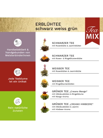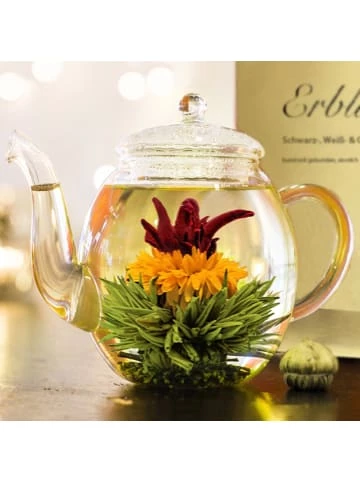 3x Teeblumen Geschenkset: – 6er Box Grüner Tee „Fruity Flavor“ in 6 Geschmackssorten (Kirsche, Mango, Lemon, Himbeere, Erbeere, Pfirsich) inkl. Teekanne 0.5l– 6er Box Weißer Tee inkl. Teekanne 0.5l– 6er Box Mix Grüner/Weißer/Schwarzer Tee inkl. Teekanne 0.5lDas ErlebnisDer Erblüh-Tee bietet dem Genießenden ein außergewöhnliches Erlebnis: Im Innern der Kugel befindet sich eine kunstvoll eingebundene exotische Blüte. Ihr Geheimnis entfaltet die Kugel aber erst, wenn sie in ein Gefäß mit kochend heißem Wasser gegeben wird. Sie beginnt sich langsam zu öffnen und bringt am Ende der Aufgussinszenierung die eingebettete Blüte hervor, die formenreich und farbenprächtig aus ihr emporsteigt.An diesem Tee ist fast alles Handarbeit. Nur wenigen so genannten Meisterbinderinnen ist es vorbehalten, die getrockneten Blätter des Weißen Tees zu einer Kugelform zu binden, denn das Wissen um diese seltene Kunst wird streng behütet. So bleibt der ErblühTee eine wertvolle Rarität Chinas.Die Zubereitung:Schritt 1: Wasser aufkochen und unverzüglich in Glaskaraffe geben. Bitte beachten: Im Gegensatz zur Grünteezubereitung ist hier die Verwendung von kochend heißem Wasser notwendig, um eine optimale Öffnung der ErblühTee-Kugeln zu gewährleisten.Schritt 2: ErblühTee-Kugel vorsichtig ins Wasser geben und staunen…Schritt 3: Bitte die empfohlene Ziehdauer beachten. Es sind 2-3 Aufgüsse möglich, die in ihrer Geschmacksintensität variieren werden.ZUTATEN:Weißer Tee, Blüten von Ringelblume, Pfingstrose, Rose, Jasmin ErblühTee ist teeinhaltig. Kühl und trocken lagernZUTATEN:Grüner Tee, Blüten von Hibiskus, Ringelblume, Jasmin, Rose und Holunder, Aroma (Pfirsich, Lemon, Mango, Erdbeere, Himbeere, Kirsche)ZUTATEN:Weißer Tee, Blüten von Ringelblume, RoseSchwarzer Tee, Blüten von Ringelblume, Rose, JasminGrüner Tee, Blüten von Ringelblume, Hibiskus, Jasmin, AromaDer Inhalt:3x elegante Creano Glasteekanne, handgefertigt, ca. 500ml Fassungsvermögen3x 6 ErblühTee-Kugeln in 6 verschiedenen Sorten Nettogewicht ca. 3x39grVerantwortlicher Lebensmittelunternehmer:Creano GmbHIn der Wanne 131832 Springe