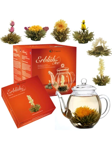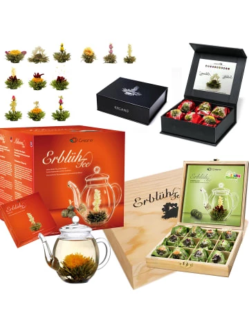 3 tlg. Weihnachts-Set XXL ErblühTee: – Geschenkset Weißer Tee: 6er Box Teeblumen mit Glas-Teekanne 0.5l– 6er Magnet-Präsentbox Weißer Tee– 12er Holz-Präsentbox Grüner Tee „Fruity Flavor“ in 6 Sorten (Kirsche, Mango, Lemon, Himbeere, Erbeere, Pfirsich)Das ErlebnisDer Erblüh-Tee bietet dem Genießenden ein außergewöhnliches Erlebnis: Im Innern der Kugel befindet sich eine kunstvoll eingebundene exotische Blüte. Ihr Geheimnis entfaltet die Kugel aber erst, wenn sie in ein Gefäß mit kochend heißem Wasser gegeben wird. Sie beginnt sich langsam zu öffnen und bringt am Ende der Aufgussinszenierung die eingebettete Blüte hervor, die formenreich und farbenprächtig aus ihr emporsteigt.An diesem Tee ist fast alles Handarbeit. Nur wenigen so genannten Meisterbinderinnen ist es vorbehalten, die getrockneten Blätter des Weißen Tees zu einer Kugelform zu binden, denn das Wissen um diese seltene Kunst wird streng behütet. So bleibt der ErblühTee eine wertvolle Rarität Chinas.Die Zubereitung:Schritt 1: Wasser aufkochen und unverzüglich in Glaskaraffe geben. Bitte beachten: Im Gegensatz zur Grünteezubereitung ist hier die Verwendung von kochend heißem Wasser notwendig, um eine optimale Öffnung der ErblühTee-Kugeln zu gewährleisten.Schritt 2: ErblühTee-Kugel vorsichtig ins Wasser geben und staunen…Schritt 3: Bitte die empfohlene Ziehdauer beachten. Es sind 2-3 Aufgüsse möglich, die in ihrer Geschmacksintensität variieren werden.ZUTATEN:Weißer Tee, Blüten von Ringelblume, Pfingstrose, Rose, Jasmin ErblühTee ist teeinhaltig. Kühl und trocken lagernZUTATEN:Grüner Tee, Blüten von Hibiskus, Ringelblume, Jasmin, Rose und Holunder, Aroma (Pfirsich, Lemon, Mango, Erdbeere, Himbeere, Kirsche)Der Inhalt:– Geschenkset Weißer Tee: 6er Box Teeblumen mit Glas-Teekanne 0.5l– 6er Magnet-Präsentbox Weißer Tee– 12er Holz-Präsentbox Grüner Tee „Fruity Flavor“ in 6 Sorten (Kirsche, Mango, Lemon, Himbeere, Erbeere, Pfirsich)Verantwortlicher Lebensmittelunternehmer:Creano GmbHIn der Wanne 131832 SpringeMindesthaltbarkeitsdatum: Informationen zum Mindesthaltbarkeitsdatum entnimmst Du der Verpackung.