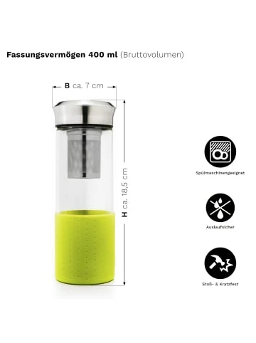 3 delikate Teemischungen: Erdbeer-Minze, Exotische Früchte, Sanfte Zitrone. Geeignet auch als EisTees!Kombiniert mit einer edlen Auswahl an Teamakern:– Sanfte Zitrone 60g – Kräuter-Teemischung aus Früchten und Kräutern mit LimettengeschmackZUTATEN: Apfelstücke, Hagebuttenschalen, Zitrusscheiben, Zitrusschalen, Sonnenblumenblätter, Erbeerscheiben, Lemongras, Erdbeerstücke, Säuerungsmittel Zitronensäure, Aroma.– Exotische Früchte 60g – exotische Früchte-Teemischung mit fruchtig süßem GeschmackZUTATEN: Hibiskusblüten, Hagebutten, Ananasstücke (Ananas, Zucker, Säuerungsmittel: Zitronensäure), Mangostücke (Mango, Zucker, Säuerungsmittel: Zitronensäure), Karottenstücke, Mandarinenstücke (Mandarine, Rohrzucker, Säuerungsmittel Zitronensäure), Apfelecken, Kokos-Chips, Aroma, Erdbeerscheiben, Tee– Erdbeer Minze 60g – Kräuter-/Früchteteemischung mit Erdbeer-Minze GeschmackZUTATEN: Apfelstücke, weiße Bohnenschalen, Beerenblätter (Brombeerblätter, schwarze Johannisbeerblätter), Brennnesselblätter, Pfefferminze, Krauseminze, Erdbeerstücke, AromaVerantwortlicher Lebensmittelunternehmer:Creano GmbHIn der Wanne 1D-31832 Springe,– Trinke direkt aus dem Teamaker oder fülle den Tee in eine Tasse. Der Silikonfuß sorgt für sicheren Stand. – Fest geschlossen hält der Teamaker 100 % dicht – ideal für die Handtasche oder den Rucksack.Produktdetails Teamaker:– Lieferumfang Teamaker: 1 Teamaker mit Edelstahlsieb & -deckel, Silikonfuß, Neoprenhülle, Fassungsvermögen 400 ml– Das Glas ist spülmaschinenfest.– Robustes Edelstahlsieb und -deckel – Im fest geschlossenen Zustand ist der Teamaker zu 100 % dicht.– Glasöffnung mit ca. 5,5 cm Durchmesser