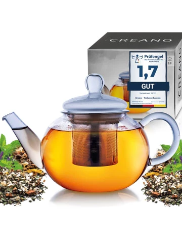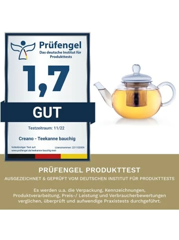 Die Creano-Teekanne mit integriertem Glassieb wurde speziell für die Zubereitung von losen Tees und TeeSchmuckstücken konzipiert. Bei der Herstellung wurden die besonderen Anforderungen berücksichtigt, die diese Teekanne erfüllen muss, um den optischen und geschmacklichen Zauber von losen Tees und TeeSchmuckstücken optimal entfalten zu können. Durch einfaches Herausnehmen des Glassiebes ist diese Kanne ebenfalls für die Nutzung von Teebeuteln und sogar ErblühTees universell einsetzbar.