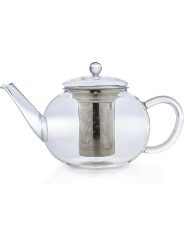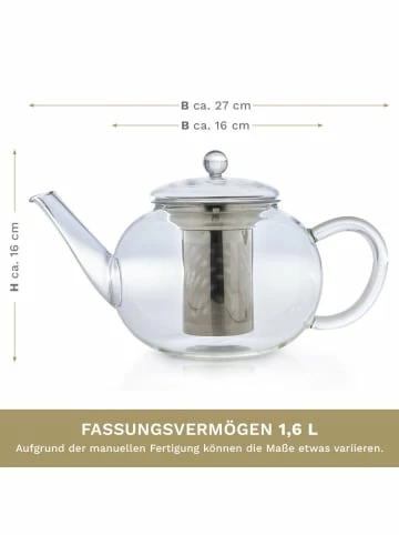 Creano Komplett Teekanne 1,6l mit integriertem Edelstahlfilter und Glasdeckel: universell, edel und sauber, ohne zu tropfen – das sind die vielseitigen Attribute der Creano Glas Teekanne 1,6l.Die Fertigung erfolgt ausschließlich auf Basis hochwertiger Materialen: die Teekanne mit Glasdeckel wird aus hitzebeständigem Borosilikatglas erzeugt. Der herausnehmbare Filter besteht aus hochwertigem Edelstahl. Auch ohne Filtereinsatz. Ein Handgriff und der Edelstahlfilter ist ausgetauscht! Tees aller Art, ob loser Tee, ErblühTee oder Teebeutel, sind somit auf einfache Weise in der GlasTeekanne delikat zuzubereiten.Für den Gebrauch auf einem Stövchen, in der Spülmaschine und Mikrowelle geeignet.Inhalt 1 GlasTeekanne 1,6l mit Edelstahlfilter, Glasdeckel