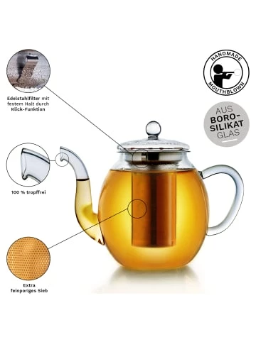 • ANGEBOT: Die Glaskanne mit Deckel und Edelstahlsieb im zeitlosen Design fasst 1000ml, das entspricht ca. 4-5 Tassen. Der Teebereiter ist ideal für die Zubereitung von losem Tee, Kräutertee, Früchtetee, Teebeutel, Teeblumen aber auch für Kaffee, Eistee, Säfte und Schorlen geeignet. Geliefert wird in einen hochwertigen Geschenkkarton. • INKLUSIVE: 2 ErblühTee weißer Tee & grüner Tee – Jede Blooming Tea Blüte ist bis zu 3x aufgießbar – und ergibt somit jeweils ca. 1,5l Tee für wahre Genießer. Der milde Weißtee/Grüntee wird lieblich ergänzt durch Ringelblumen, Jasminblüten und Hibiskusblüten. Aufgrund seiner hohen Güte und geringem Anteil an Bitterstoffen, verträgt der Tee lange Ziehzeiten und garantiert ein ausgedehntes optisches Erlebnis. • BESONDERHEITEN: Durch das robuste und hitzebeständige Borosilikatglas kann die Teekanne relativ dünnwandig produziert werden und hat trotzdem eine sehr hohe Stoß- & Kratzfestigkeit. Der Vorteil: die Tee-Kanne ist leicht und filigran. Das extra feine Sieb, hält selbst feinste Teepartikel zurück, somit befinden keine lästigen Schwebstoffe im Getränk. Vorsicht beim Umgang mit kochendem Wasser, Kinder sind unbedingt fern zu halten. • MERKMALE: Die Maße der Kanne sind: ca. 12cm Durchmesser des Kannenkörpers & 21cm mit Henkel und Tülle sowie ca. 16cm Hoch inkl. Deckel, kleine Abweichungen sind Aufgrund der Handarbeit produktionsbedingt möglich. Die Glasteekanne und der Siebeinsatz sind 100% spülmaschinenfest, frei von Chemikalien und absolut geschmacksneutral. Perfekt für einen sorglosen & puren Tee-Genuss. • 100% TROPFFREI: Der Ausgießer besitzt innen eine extra Vertiefung und außen eine kleine Nase die jeden Tropfen zurück hält und die Teekanne damit 100% tropffrei macht. Achtung: Da es sich um einen Glasartikel handelt, seien Sie bitte bei der Reinigung vorsichtig. Zutaten Teeblumen:Grüner Tee, Weißer Tee, Ringelblumen, Jasminblüten und Hibiskusblüten, AromaInhalt: 1x Teekanne 1.0l mit Edelstahlsieb, 2 Teeblumen aus grünem und weißem TeeVerantwortlicher Lebensmittelunternehmer:Creano GmbHIn der Wanne 131832 Springe