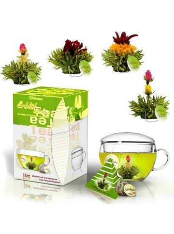 3 tlg. Weihnachts-Set XXL Teelini-Teeblumen: – Geschenkset Teelini Grüner Tee: 8er Box Teeblumen in 4 Sorten fein aromatisiert (Erdbeer, Kirsch, Mango, Zitrone) mit 1x Glas-Tasse mit Deckel 200ml– 6er Magnet-Präsentbox Weißer Tee in 4 Sorten fein aromatisiert (Vanille, Jasmin, Pfirsich, Zitrone)– 12er Holz-Präsentbox Weißer Tee in 4 Sorten fein aromatisiert (Vanille, Jasmin, Pfirsich, Zitrone)Welt-Neuheit und exklusiv bei CreanoDie revolutionäre Neuheit liegt in der Kombination aus tassenportioniertem ErblühTee mit integriertem Baumwollfaden, der ein einfaches Handling gleich eines Teebeutels erlaubt.Die ErblühTeeliniBei einem Teelini handelt es sich um ein fein aromatisierten ErblühTee in einem speziell für den Gebrauch als Tassenportion entwickelten Format. Ein Teelini ist ErblühTee, der sich durch einfaches Handling gleich eines Teebeutels auszeichnet.Das ErlebnisDer ErblühTee bietet dem Genießenden ein außergewöhnliches Erlebnis: Im Innern der Kugel befindet sich eine kunstvoll eingebundene exotische Blüte. Ihr Geheimnis entfaltet die Kugel aber erst, wenn sie in ein Gefäß mit kochend heißem Wasser gegeben wird. Sie beginnt sich langsam zu öffnen und bringt am Ende der Aufgussinszenierung die eingebettete Blüte hervor, die formenreich und farbenprächtig aus ihr emporsteigt.An diesem Tee ist fast alles Handarbeit. Nur wenigen so genannten Meisterbinderinnen ist es vorbehalten, die getrockneten Blätter des Weißen Tees zu einer Kugelform zu binden, denn das Wissen um diese seltene Kunst wird streng behütet. So bleibt der ErblühTee eine wertvolle Rarität Chinas.Zubereitung / HandlingSchritt 1: Wasser aufkochen und unverzüglich in Tasse geben. Bitte beachten: Im Gegensatz zur Grünteezubereitung ist hier die Verwendung von kochend heißem Wasser notwendig, um eine optimale Öffnung des ErblühTeelinis zu gewährleisten.Schritt 2: ErblühTeelini vorsichtig ins Wasser geben und staunen…Schritt 3: Bitte die empfohlene Ziehdauer von 6-8 Minuten beachten. Es sind 2-3 Aufgüsse möglich, die in ihrer Geschmacksintensität variieren werden.ZUTATEN:Weißer Tee; Blüten von Ringelblume, Rose, Jasmin, Aroma (Vanille, Jasmin, Zitrone, Pfirsich)ZUTATEN:Grüner Tee, Blüten von Ringelblume, Jasmin, Hibiskus, Holunder, Rose, Aroma (Erdbeer, Kirsch, Mango, Zitrone)Der Inhalt:– Geschenkset Teelini Grüner Tee: 8er Box Teeblumen mit Glas-Tasse + Deckel 0.2l– 6er Magnet-Präsentbox Teelini Weißer Tee– 12er Holz-Präsentbox Teelini Weißer Tee Verantwortlicher Lebensmittelunternehmer:Creano GmbHIn der Wanne 131832 SpringeMindesthaltbarkeitsdatum: Informationen zum Mindesthaltbarkeitsdatum entnimmst Du der Verpackung.