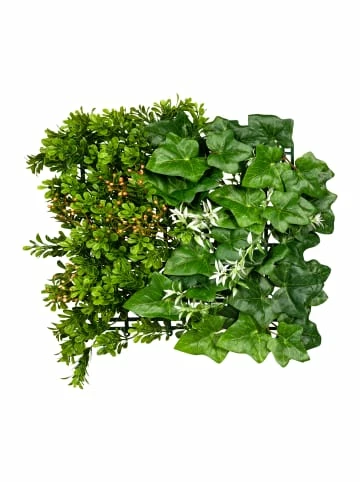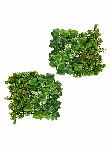 Immergrüner Blickfang für Deine Wohnräume – Langlebig, pflegeleicht und vielseitig verwendbar – Liebevoll der Natur nachempfunden & hochwertig verarbeitetEin trendiger Blickfang! Sei kreativ und verwirkliche Deine individuellen Dekorations-Ideen mit diesen Matten aus einem feingearbeiteten Mix aus Buchsbaum- und Efeu-Blättern. Jede Matte verfügt über Ösen und Haken, somit können mehrere Matten verbunden werden. Detailgetrau aus Kunststoff gefertigt, langlebig und vielseitig einsetzbar sind in der Anwendung so gut wie keine Grenzen gesetzt: sei es als Bodendecker in Pflanzen-Arrangements oder mehrzählig als komplett begrünte Wand in Deinem Zuhause – Du und Deine Besucher werden begeistert sein. Das Set besteht aus 2 Matten in der Größe 33×33 cm. Die Matten besthen aus Kunststoff und textilem Material.