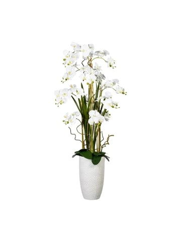 Traumhaft schöner Blickfang für Deine Wohnräume – Langlebig, pflegeleicht und vielseitig verwendbar – Liebevoll der Natur nachempfunden & hochwertig verarbeitetStilvoll und dekorativ präsentiert sich diese prächtige Orchidee Phalaenopsis mit Real-Touch-Blüten. Die Orchideen-Nachbildung besticht vor allem durch ihr blütenreiches und feingearbeitetes Aussehen – liebevoll und detailgetreu der Natur nachempfunden ist sie nur auf den zweiten Blick vom Original zu unterscheiden. Zeitlos in einem Topf aus hochwertiger Keramik wird diese pflegeleichte Orchidee zu einem Highlight und setzt ein geschmackvolles Statement in Deinem Ambiente. Ob in Deinem Wohnzimmer oder im Empfangsbereich – dieser Blütentraum zaubert eine trendige Atmosphäre in Deine Räumlichkeiten. Auch eine tolle Geschenkidee! Die Kunstpflanze besteht aus Kunststoff. Die Höhe der Pflanze beträgt ca. 160 cm. Der Keramiktopf hat die Maße Durchmesser ca. 26 cm, Höhe ca. 45 cm. Die Dekopflanze ist in den Farben weiß und lila erhältlich.