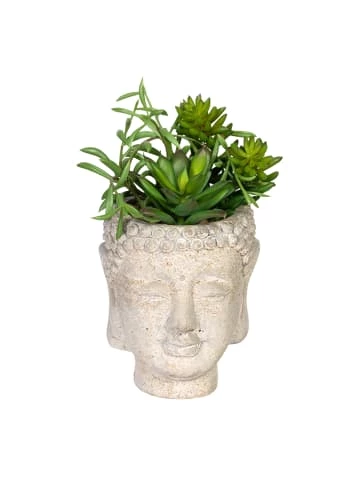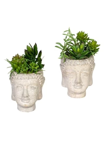 Bewachsene Buddha-Köpfe als trendiger Blickfang! An diesem Set aus 2 verschiedenen Sukkulentenarrangements wirst Du Dich viele Jahre erfreuen. Die hochwertige und naturgetreue Anmutung sowie die vielseitigen Einsatzmöglichkeiten machen diese Sukkulenten im Buddha-Kopf aus feingearbeitetem Zement zu langlebigen Lieblingen in Deiner Dekoration. Ob auf Deinem Schreibtisch, als Tischdeko oder auf Deinem Sideboard – dieses immergrüne Ensemble wird in jedem Ambiente zum vielfältigen Eyecatcher. Auch eine tolle Geschenkidee! Das Set besteht aus 2 verschiedenen Sukkulentenarrangements im Buddha-Kopf (Durchmesser ca. 8 cm, Höhe ca. 10 cm). Die Pflanzen bestehen aus Kunststoff, die Töpfe aus Zement.