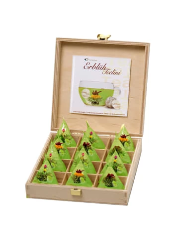• ANGEBOT: Teelini Teeblumen im praktischen Format für eine Tasse im Geschenkset mit 12 verschiedenen Teerosen in 4 Sorten – Grüntee. Unser Angebot für echte Teeliebhaber wird in einer dekorativen Holzbox geliefert und ist ideal als Geschenk geeignet. • MERKMALE: Die Blooming Tea Teeblüte öffnet sich in der Tasse und entfaltet ihre ganze Schönheit und den leicht-fruchtigen Geschmack. Es sind bis zu drei Aufgüsse je Kugel möglich. Der milde Grüntee wird lieblich ergänzt durch Ringelblumen, Jasminblüten, Hibiskus & Rosen und ist in den Sorten Kirsche, Erdbeere, Zitrone oder Mango aromatisiert. Aufgrund seiner hohen Güte und geringem Anteil an Bitterstoffen, verträgt der Tee lange Ziehzeiten und garantiert ein ausgedehntes optisches Erlebnis. • QUALITÄT: Creano ErblühTees sind ein Markenprodukt von aller bester Güte. Wir legen größten Wert auf die Qualität des Tees, Blüten sowie der Funktion und Optik. Als Mitglied des deutschen Teeverbands stehen wir für größtmögliche Produktsicherheit und unterliegen dem „Code of Conduct“Geschmacklich ist der Grüne Tee dezent und überzeugt durch seinen zart-fruchtigen aromatischen Geschmack. Die unterschiedlich kunstvoll eingearbeiteten Blüten und sortenabhängige feine Aromen (Erdbeer, Kirsch, Mango und Zitone) verleihen dem ErblühTeelini eine zusätzliche individuelle Geschmacksnote. Die Sorten / Variationen 12 ErblühTeelini in 4 Variationen, Nettogewicht ca. 60g • Grüner Tee mit Ringelblume, Jasminblüten & Erdbeer-Aroma• Grüner Tee mit Hibiskus- und Holunderblüten & Kirsch-Aroma• Grüner Tee mit Ringelblume, Hibiskusblüte & Mango-Aroma• Grüner Tee mit Rosenböüten & Zitrus-AromaDie Zutaten Grüner Tee, Blüten von Ringelblume, Jasmin, Hibiskus, Holunder, Rose, Aroma (Erdbeer, Kirsch, Mango, Zitrone) Verantwortlicher Lebensmittelunternehmer:Creano GmbHIn der Wanne 131832 SpringeMindesthaltbarkeitsdatum: Informationen zum Mindesthaltbarkeitsdatum entnimmst Du der Verpackung.