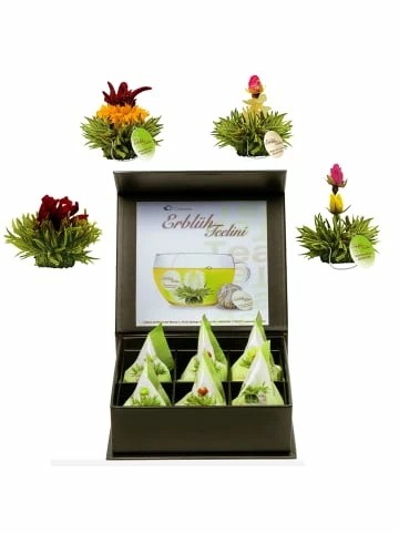 • ANGEBOT: Teelini Teeblumen im praktischen Format für eine Tasse im Geschenkset mit 6 verschiedenen Teerosen in 4 Sorten – Grüntee. Unser Angebot für echte Teeliebhaber wird in einer dekorativen Holzbox geliefert und ist ideal als Geschenk geeignet. • MERKMALE: Die Blooming Tea Teeblüte öffnet sich in der Tasse und entfaltet ihre ganze Schönheit und den leicht-fruchtigen Geschmack. Es sind bis zu drei Aufgüsse je Kugel möglich. Der milde Grüntee wird lieblich ergänzt durch Ringelblumen, Jasminblüten, Hibiskus & Rosen und ist in den Sorten Kirsche, Erdbeere, Zitrone oder Mango aromatisiert. Aufgrund seiner hohen Güte und geringem Anteil an Bitterstoffen, verträgt der Tee lange Ziehzeiten und garantiert ein ausgedehntes optisches Erlebnis. • QUALITÄT: Creano ErblühTees sind ein Markenprodukt von aller bester Güte. Wir legen größten Wert auf die Qualität des Tees, Blüten sowie der Funktion und Optik. Als Mitglied des deutschen Teeverbands stehen wir für größtmögliche Produktsicherheit und unterliegen dem „Code of Conduct“Geschmacklich ist der Grüne Tee dezent und überzeugt durch seinen zart-fruchtigen aromatischen Geschmack. Die unterschiedlich kunstvoll eingearbeiteten Blüten und sortenabhängige feine Aromen (Erdbeer, Kirsch, Mango und Zitone) verleihen dem ErblühTeelini eine zusätzliche individuelle Geschmacksnote. Die Sorten / Variationen 6 ErblühTeelini in 4 Variationen, Nettogewicht ca. 30g • Grüner Tee mit Ringelblume, Jasminblüten & Erdbeer-Aroma• Grüner Tee mit Hibiskus- und Holunderblüten & Kirsch-Aroma• Grüner Tee mit Ringelblume, Hibiskusblüte & Mango-Aroma• Grüner Tee mit Rosenböüten & Zitrus-AromaDie Zutaten Grüner Tee, Blüten von Ringelblume, Jasmin, Hibiskus, Holunder, Rose, Aroma (Erdbeer, Kirsch, Mango, Zitrone) Verantwortlicher Lebensmittelunternehmer:Creano GmbHIn der Wanne 131832 SpringeMindesthaltbarkeitsdatum: Informationen zum Mindesthaltbarkeitsdatum entnimmst Du der Verpackung.