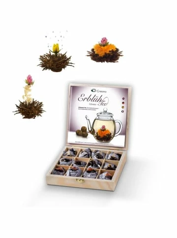 Faszination „ErblühTee“Der ErblühTee von Creano bietet dem Genießenden ein außergewöhnliches Erlebnis: Im Innern der Kugel befindet sich eine kunstvoll eingebundene exotische Blüte. Ihr Geheimnis entfaltet die Kugel aber erst, wenn sie in ein Gefäß mit kochend heißem Wasser gegeben wird. Sie beginnt sich langsam zu öffnen und bringt am Ende der Aufgussinszenierung die eingebettete Blüte hervor, die formenreich und farbenprächtig aus ihr emporsteigt.Schwarzer Tee – FrühjahrsleseDer ErblühTee besteht aus feinem Schwarzen Tee (Bai Hao Yin Zhen, Silver needle fermentiert) aus den hohen Bergregionen der Provinz Fujian in China. Außergewöhnlich bei diesem Schwarztee ist, dass nur die hochwertigen Teeblattknospen Verwendung finden, die in einem schonenden Fermentationsverfahren zu diesem exklusiven Schwarztee veredelt werden.Die begehrte „erste Pflückung“ des Schwarzen Tees ist die hochwertigste Lese im Jahr. Sie erfolgt zu Frühlingsbeginn und ist besonders in Qualität und Geschmack.Das Geschmackserlebnis:Geschmacklich ist dieser Schwarze Tee ungewöhnlich lieblich mild. Er verträgt außergewöhnlich lange Ziehzeiten ohne zu verbittern und überzeugt durch seinen vollmundigen aromatischen Geschmack. Die unterschiedlich kunstvoll eingearbeiteten Blüten des ErblühTees geben dem Tee eine zusätzliche individuelle Geschmacksnote.Die Zubereitung:Schritt 1: Ca. 500ml Wasser aufkochen und unverzüglich in Glaskanne geben. Bitte beachten: Im Gegensatz zur Grünteezubereitung ist hier die Verwendung von kochend heißem Wasser notwendig, um eine optimale Öffnung der ErblühTee-Kugeln zu gewährleisten.Schritt 2: ErblühTee-Kugel vorsichtig ins Wasser geben und staunen…Schritt 3: Bitte die empfohlene Mindestziehdauer beachten. Dieser hochwertige Schwarztee verträgt lange Ziehzeiten ohne zu verbittern.Die Sorten / Variationen:Rote Affäre (Silver Needle mit Blüten der Rose (Damascena) & Jasmin)Purple Shine (Silver Needle mit Blüten der Ringelblume & Rose (Damascena))Vulkangeflüster (Silver Needle mit Blüten der Rose (Centifolia) & Lavendel)ZUTATEN:Schwarzer Tee (mind. 95%); Blüten (1-5%) von Ringelblume, Rose (Damascena & Centifolia), Jasmin, LavendelErblühTee ist teeinhaltig. Kühl und trocken lagern.Die Creano ErblühTee-Holzkiste:Die 12 ErblühTee-Kugeln in 3 verschiedenen Variationen sind in einer stilechten Holzkiste verpackt, welche das Teeerlebnis vom ersten Augenblick an zu etwas ganz Besonderem macht. Die Stabilität der Verschlüsse und Scharniere gewährleistet auch eine Nutzung nach dem Verbrauch des Tees und kann je nach Belieben mit Nachfüllpackungen der ErblühTee-Kugeln nachgefüllt werden. Eine dekorative Nutzung bietet sich ebenso an.Der Inhalt:12 Creano ErblühTee-Kugeln in 3 verschiedenen Variationen1 elegante Creano ErblühTee-HolzkisteZUTATEN:Schwarzer Tee (min. 95%); Blüten (1-5%) von Ringelblume, Rose (Damascena), Jasmin, Rose (Centifolia), LavendelVerantwortlicher Lebensmittelunternehmer:Creano GmbHIn der Wanne 131832 SpringeMindesthaltbarkeitsdatum: Informationen zum Mindesthaltbarkeitsdatum entnimmst Du der Verpackung.