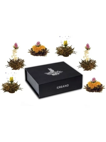 Faszination „ErblühTee“Der ErblühTee von Creano bietet dem Genießenden ein außergewöhnliches Erlebnis: Im Innern der Kugel befindet sich eine kunstvoll eingebundene exotische Blüte. Ihr Geheimnis entfaltet die Kugel aber erst, wenn sie in ein Gefäß mit kochend heißem Wasser gegeben wird. Sie beginnt sich langsam zu öffnen und bringt am Ende der Aufgussinszenierung die eingebettete Blüte hervor, die formenreich und farbenprächtig aus ihr emporsteigt.Schwarzer Tee – FrühjahrsleseDer ErblühTee besteht aus feinem Schwarzen Tee (Bai Hao Yin Zhen, Silver needle fermentiert) aus den hohen Bergregionen der Provinz Fujian in China. Außergewöhnlich bei diesem Schwarztee ist, dass nur die hochwertigen Teeblattknospen Verwendung finden, die in einem schonenden Fermentationsverfahren zu diesem exklusiven Schwarztee veredelt werden.Die begehrte „erste Pflückung“ des Schwarzen Tees ist die hochwertigste Lese im Jahr. Sie erfolgt zu Frühlingsbeginn und ist besonders in Qualität und Geschmack.Das Geschmackserlebnis:Geschmacklich ist dieser Schwarze Tee ungewöhnlich lieblich mild. Er verträgt außergewöhnlich lange Ziehzeiten ohne zu verbittern und überzeugt durch seinen vollmundigen aromatischen Geschmack. Die unterschiedlich kunstvoll eingearbeiteten Blüten des ErblühTees geben dem Tee eine zusätzliche individuelle Geschmacksnote.Die Zubereitung:Schritt 1: Ca. 500ml Wasser aufkochen und unverzüglich in Glaskanne geben. Bitte beachten: Im Gegensatz zur Grünteezubereitung ist hier die Verwendung von kochend heißem Wasser notwendig, um eine optimale Öffnung der ErblühTee-Kugeln zu gewährleisten.Schritt 2: ErblühTee-Kugel vorsichtig ins Wasser geben und staunen…Schritt 3: Bitte die empfohlene Mindestziehdauer beachten. Dieser hochwertige Schwarztee verträgt lange Ziehzeiten ohne zu verbittern.Die Sorten / Variationen:Rote Affäre (Silver Needle mit Blüten der Rose (Damascena) & Jasmin)Purple Shine (Silver Needle mit Blüten der Ringelblume & Rose (Damascena))Vulkangeflüster (Silver Needle mit Blüten der Rose (Centifolia) & Lavendel)ZUTATEN:Schwarzer Tee (mind. 95%); Blüten (1-5%) von Ringelblume, Rose (Damascena & Centifolia), Jasmin, LavendelErblühTee ist teeinhaltig. Kühl und trocken lagern.Die Creano Magnetbox:Die 6 ErblühTee-Kugeln in 3 verschiedenen Variationen sind in einer edelen mattschwarzen mit einem silbernen Prägedruck versehenen Magnetbox verpackt, welche das Teeerlebnis vom ersten Augenblick an zu etwas ganz Besonderem macht. Die hochwertige Verarbeitung und Stabilität gewährleistet auch eine Nutzung nach dem Verbrauch des Tees und kann je nach Belieben mit Nachfüllpackungen der ErblühTee-Kugeln nachgefüllt werden. Eine dekorative Nutzung bietet sich ebenso an…Der Inhalt:6 Creano ErblühTee-Kugeln in 3 verschiedenen Variationen1 elegante Creano ErblühTee-MagnetboxZUTATEN:Schwarzer Tee (min. 95%); Blüten (1-5%) von Ringelblume, Rose (Damascena), Jasmin, Rose (Centifolia), LavendelVerantwortlicher Lebensmittelunternehmer:Creano GmbHIn der Wanne 131832 SpringeMindesthaltbarkeitsdatum: Informationen zum Mindesthaltbarkeitsdatum entnimmst Du der Verpackung.