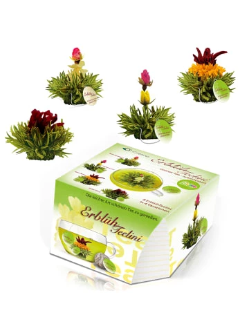 • ANGEBOT: Teelini Teeblumen im praktischen Format für eine Tasse als Probierset bzw. Geschenkset mit 8 verschiedenen Teerosen in 4 Sorten – Grüntee. Unser Angebot für echte Teeliebhaber ist ideal als Geschenk geeignet. • MERKMALE: Die Blooming Tea Teeblüte öffnet sich in der Tasse und entfaltet ihre ganze Schönheit und den leicht-fruchtigen Geschmack. Es sind bis zu drei Aufgüsse je Kugel möglich. Der milde Grüntee wird lieblich ergänzt durch Ringelblumen, Jasminblüten, Hibiskus & Rosen und ist in den Sorten Kirsche, Erdbeere, Zitrone oder Mango aromatisiert. Aufgrund seiner hohen Güte und geringem Anteil an Bitterstoffen, verträgt der Tee lange Ziehzeiten und garantiert ein ausgedehntes optisches Erlebnis. • QUALITÄT: Creano ErblühTees sind ein Markenprodukt von aller bester Güte. Wir legen größten Wert auf die Qualität des Tees, Blüten sowie der Funktion und Optik. Als Mitglied des deutschen Teeverbands stehen wir für größtmögliche Produktsicherheit und unterliegen dem „Code of Conduct“ Geschmacklich ist der Grüne Tee dezent und überzeugt durch seinen zart-fruchtigen aromatischen Geschmack. Die unterschiedlich kunstvoll eingearbeiteten Blüten und sortenabhängige feine Aromen (Erdbeer, Kirsch, Mango und Zitone) verleihen dem ErblühTeelini eine zusätzliche individuelle Geschmacksnote. Die Sorten / Variationen 8 ErblühTeelini in 4 Variationen, Nettogewicht ca. 40g • Grüner Tee mit Ringelblume, Jasminblüten & Erdbeer-Aroma• Grüner Tee mit Hibiskus- und Holunderblüten & Kirsch-Aroma• Grüner Tee mit Ringelblume, Hibiskusblüte & Mango-Aroma• Grüner Tee mit Rosenböüten & Zitrus-AromaDie Zutaten Grüner Tee, Blüten von Ringelblume, Jasmin, Hibiskus, Holunder, Rose, Aroma (Erdbeer, Kirsch, Mango, Zitrone) Verantwortlicher Lebensmittelunternehmer:Creano GmbH